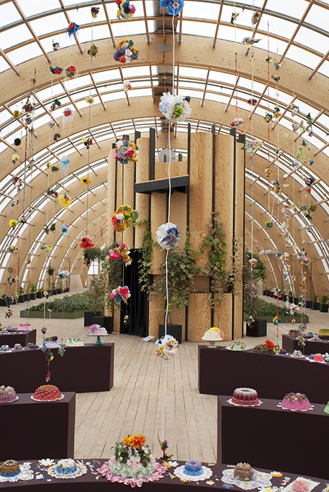The Virserums Konsthall has a 50-foot ceiling, which I incorporated into the exhibition with a cluster of 30 suspended foam chandeliers hung on hand-knotted ropes. I cast elaborate bundt cake molds in resin, hydrocal plaster, and various wax types, and then I decorated them with fanciful materials. These were displayed along with handcrafted pop culture sculptures of novelty desserts on a continuous curvilinear pedestal inspired by Borromini’s Baroque architectural facades. The exhibition included three media pieces animating the fanciful sculptures shown in the black box gallery.