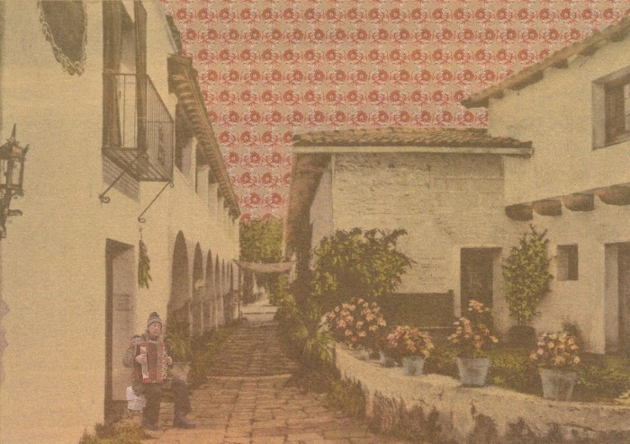 Enticed by the artistry and size of the compositions ranging from large-scale to diminutive, the viewer is encouraged to look closer. And what happens when the viewer really looks? Tucked within the stratum of colored patterns, homeless figures are embedded within the otherwise perfect landscape or architectural scene. The artist’s use of layer upon layer of color and pattern, juxtaposed with this contradicting imagery, “makes manifest the hidden realities contained in the works” and urges the viewer to reevaluate their presumptions about Santa Barbara.