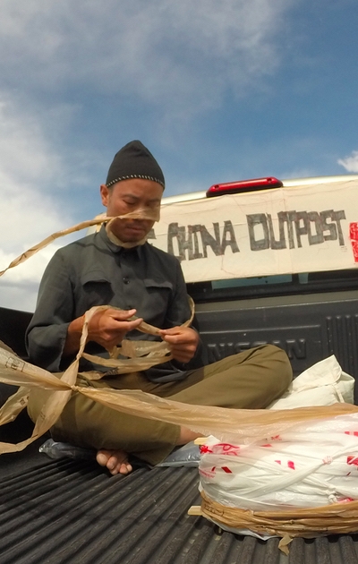 Nuttaphol Ma documents and embodies the struggle of sweatshop workers who labor, under dehumanizing conditions and for pennies on the dollar, to provide our bargain blue jeans.