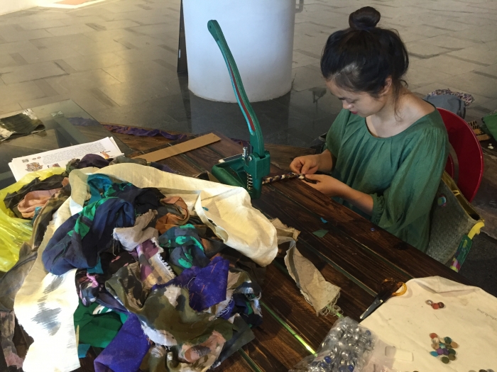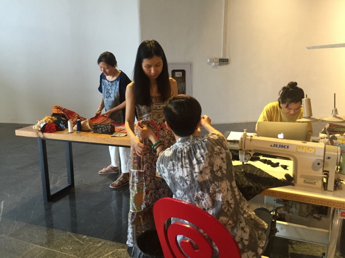 In Hà Nội, fashion designer Phạm Hồng and I organized a craftivism project titled Remake. We fashioned a 'factory' in the Heritage Space gallery mimicking Vietnamese sweatshops that contractors often locate in residential homes.