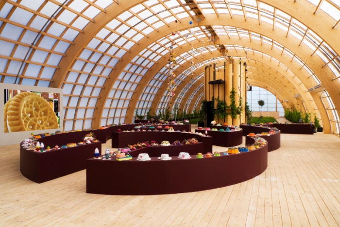 The Virserums Konsthall has a 50-foot ceiling, which I incorporated into the exhibition with a cluster of 30 suspended foam chandeliers hung on hand-knotted ropes. I cast elaborate bundt cake molds in resin, hydrocal plaster, and various wax types, and then I decorated them with fanciful materials. These were displayed along with handcrafted pop culture sculptures of novelty desserts on a continuous curvilinear pedestal inspired by Borromini’s Baroque architectural facades. The exhibition included three media pieces animating the fanciful sculptures shown in the black box gallery.