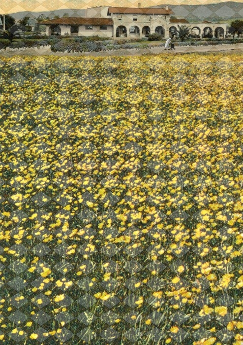 Super Natural, on view at The National Centre for Contemporary Art in Moscow, Russia, is a series of 43 digital prints and multichannel video projections. The compositions, hung salon style, began as multi-layered digital files. To create her maximalist, highly decorative “photographic compositions,” Vanderpool sourced her imagery from vintage postcards, interior design textile patterns, and her own photographs.