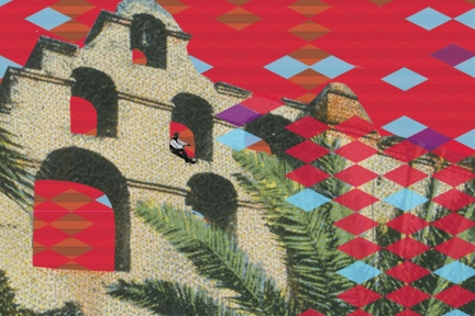 Enticed by the artistry and size of the compositions ranging from large-scale to diminutive, the viewer is encouraged to look closer. And what happens when the viewer really looks? Tucked within the stratum of colored patterns, homeless figures are embedded within the otherwise perfect landscape or architectural scene. The artist’s use of layer upon layer of color and pattern, juxtaposed with this contradicting imagery, “makes manifest the hidden realities contained in the works” and urges the viewer to reevaluate their presumptions about Santa Barbara.